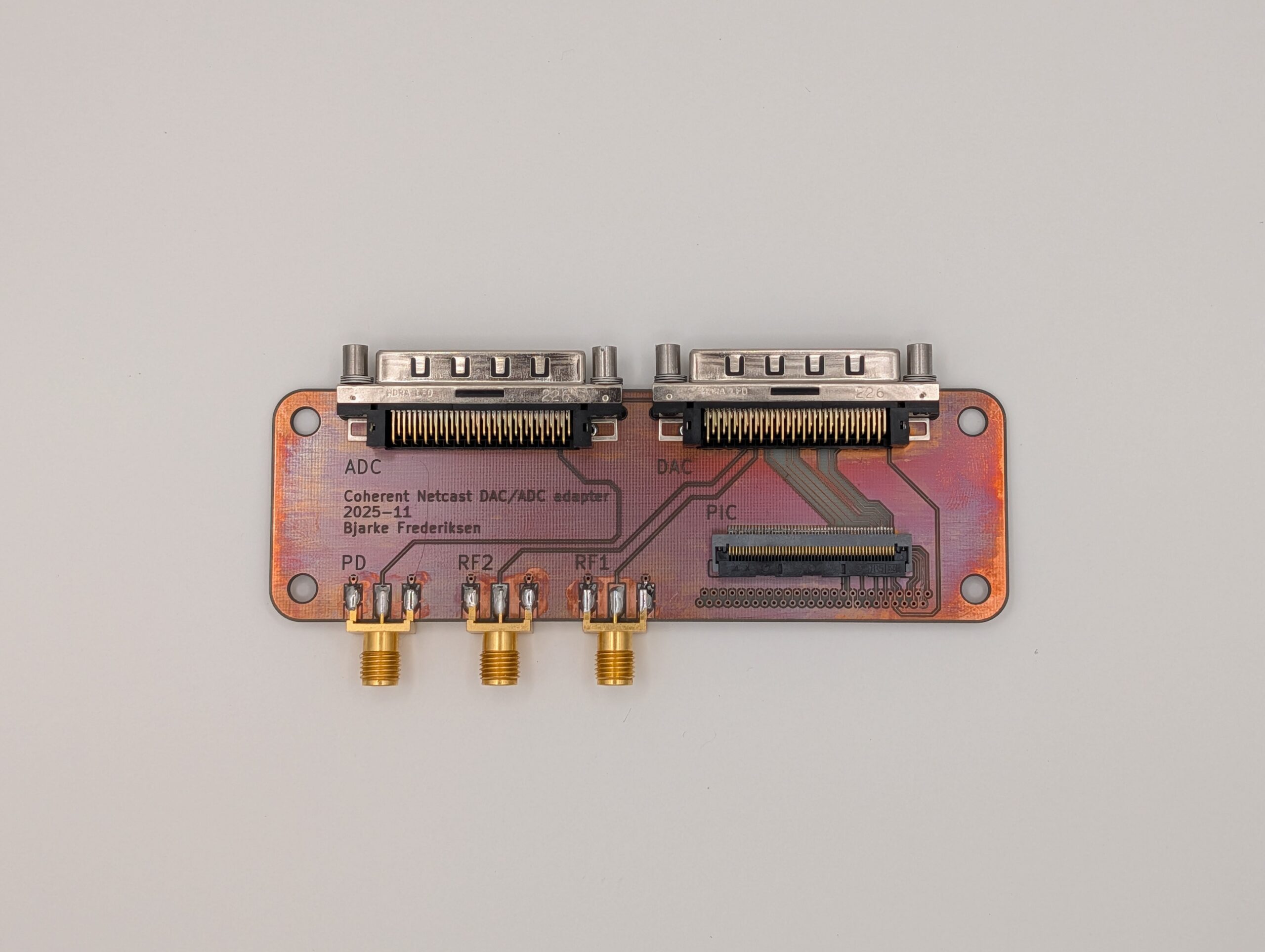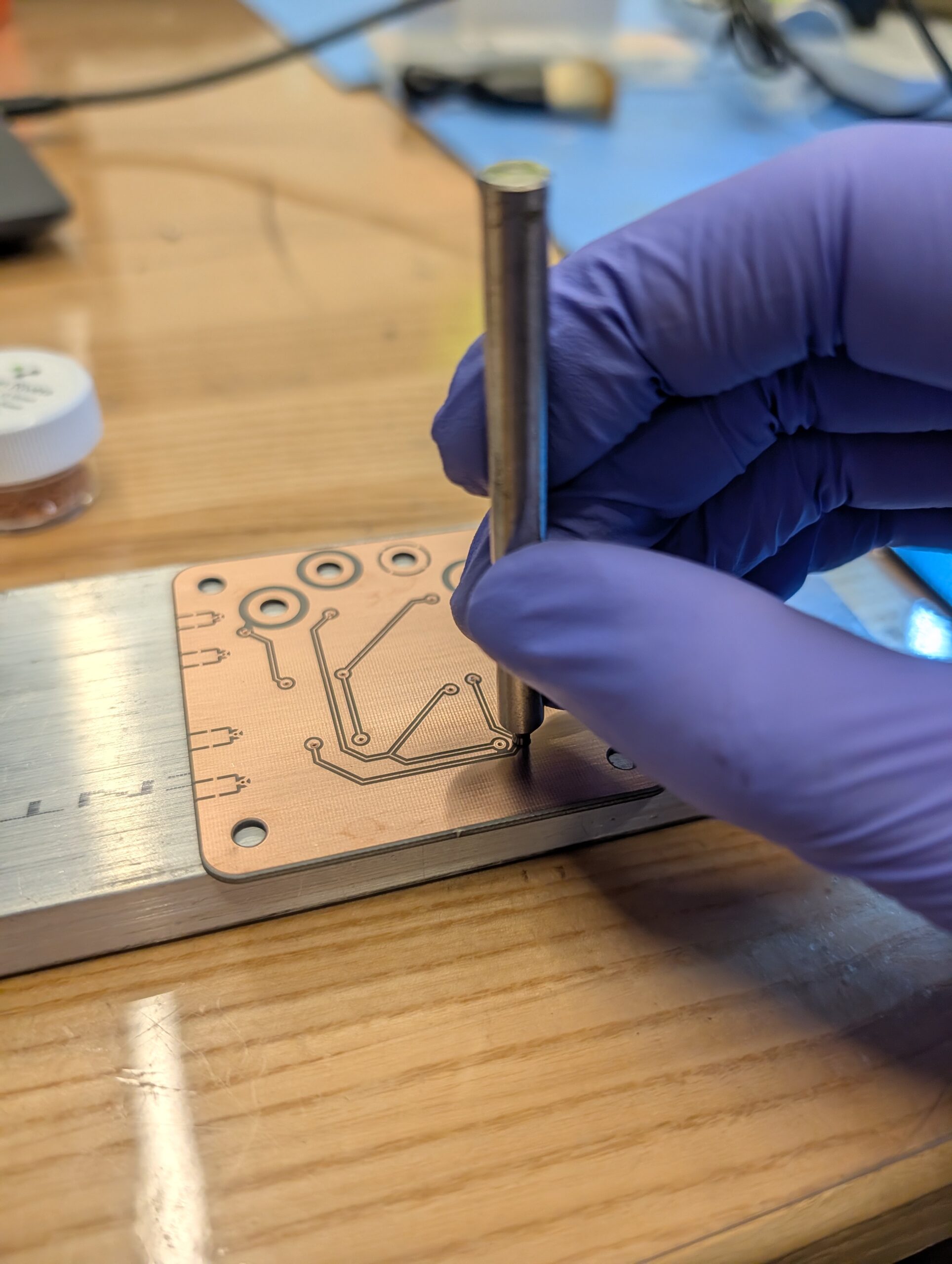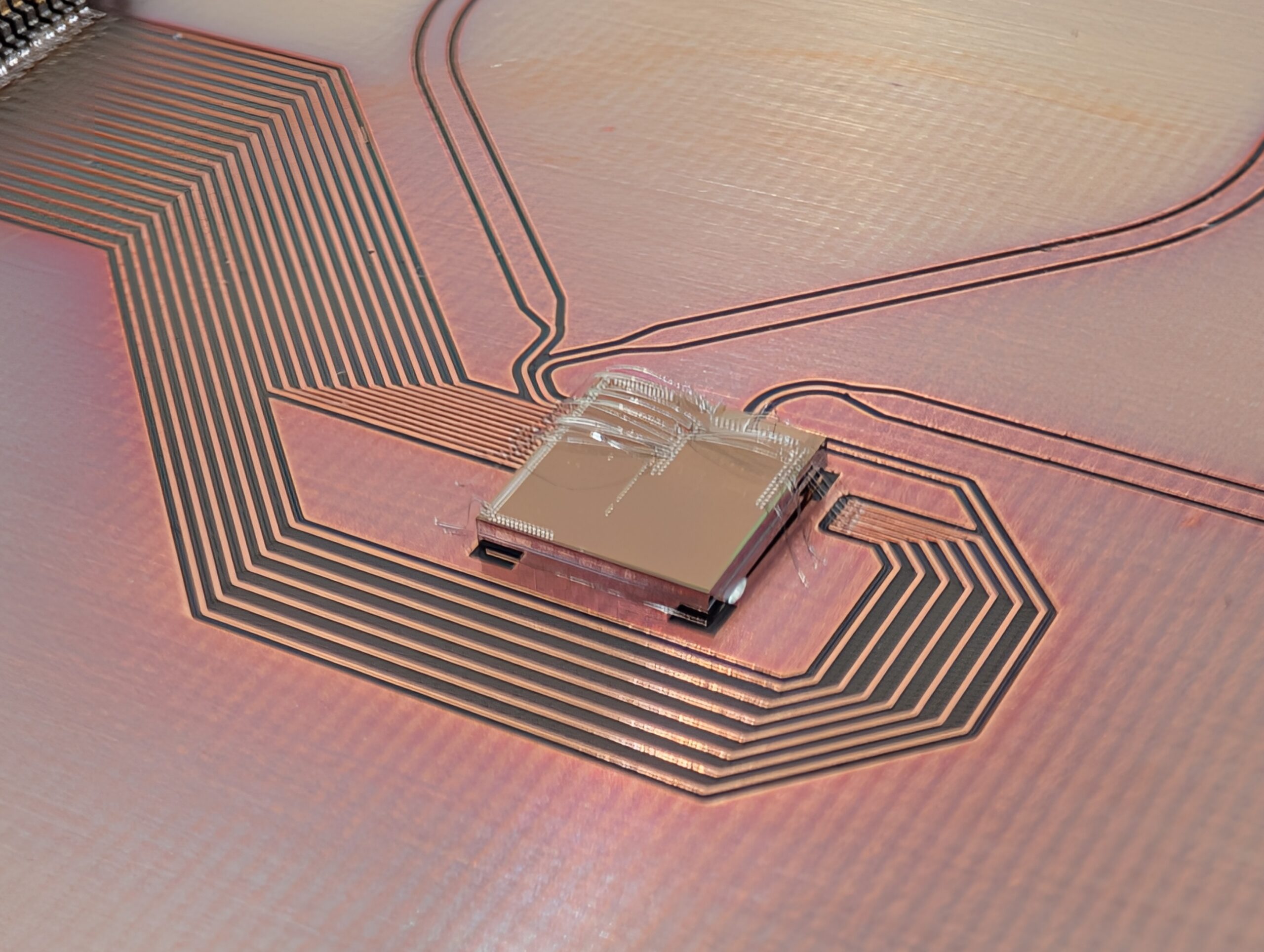 Bjarke Frederiksen, working with Professor Dirk Englund’s Quantum Photonics & AI Group, is using the Rodgers RLE Lab to develop custom PCBs for packaging photonic integrated circuits (PICs) that implement a delocalized neural network architecture. The LPKF Protolaser R4 was crucial for fabricating 2 mil trace-and-space PCBs to match the fine pad pitch on the PIC, which is bonded to a breakout board using silver paste epoxy for thermal connection and wirebonded to the PCB traces. Additional PCBs include a dual-supply transimpedance amplifier (TIA) with variable reference for extracting IV curves from integrated photodiodes, and adapter boards to interface the PIC and TIA with DAC/ADC equipment via FFC and SMA connections.