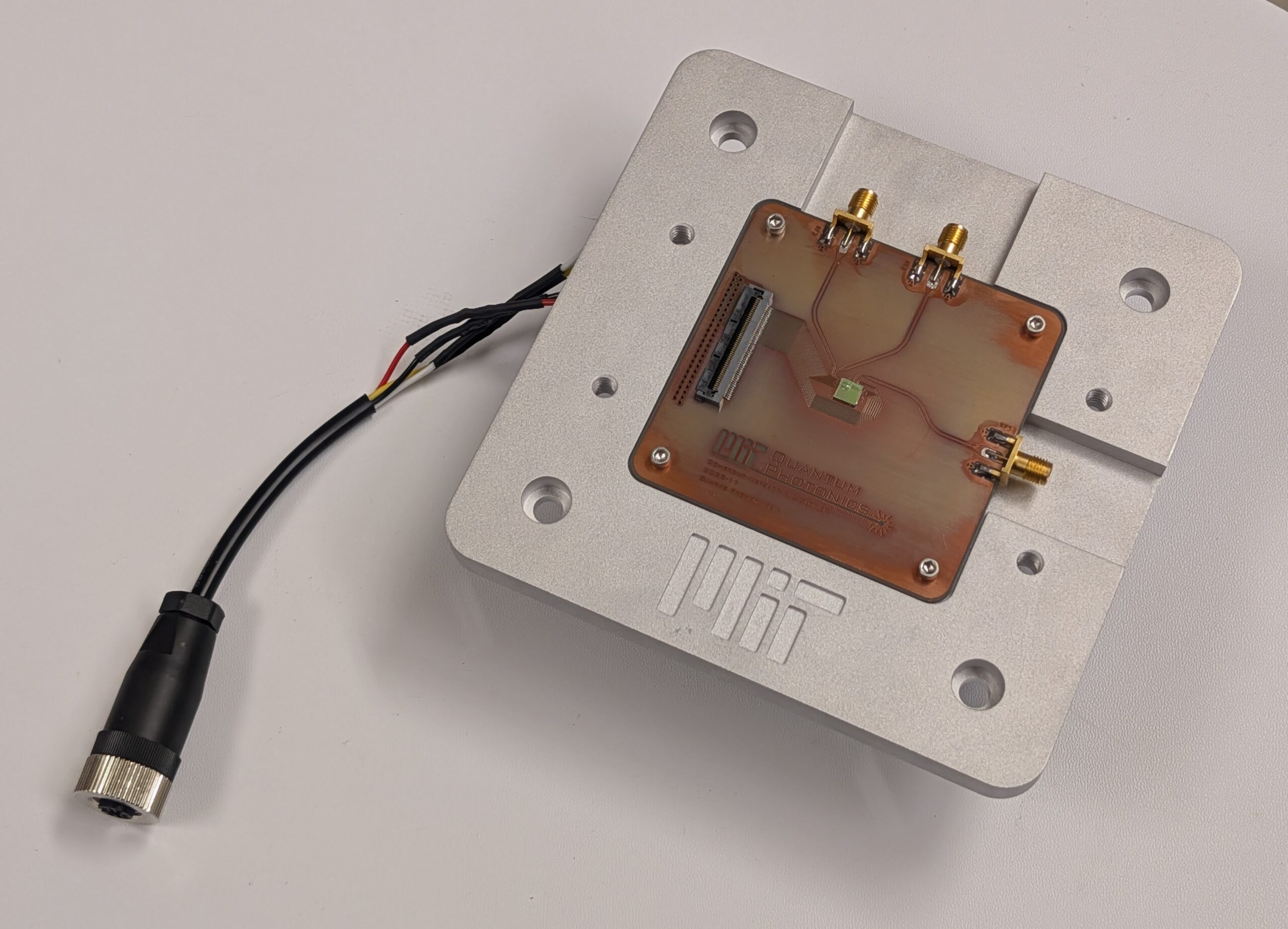 The PCBs are placed in precision-machined low-oxygen copper package bodies, gold-plated in the Rodgers RLE Lab to provide an inert finish. Using packages designed for devices that typically operate from 4 to 12 GHz, they have cryo tested packages designed for qubits as well as for Josephson traveling wave parametric amplifier chips with larger form factors (5×40 mm instead of 5×5 mm). These packages feature return losses of less than -20 dB below 15 GHz at room temperature. For higher-frequency K band devices, metal cleaning and plating equipment provided by the Rodgers RLE Lab is used to plate the through-hole vias. They have also extended the approach to multi-port packages as shown by the 8-port device featured in the picture gallery here. If you’re interested in learning more about this packaging approach, then either contact Professor O’Brien or drop by the Rodgers lab and Dr. Nagle will be glad to introduce you.