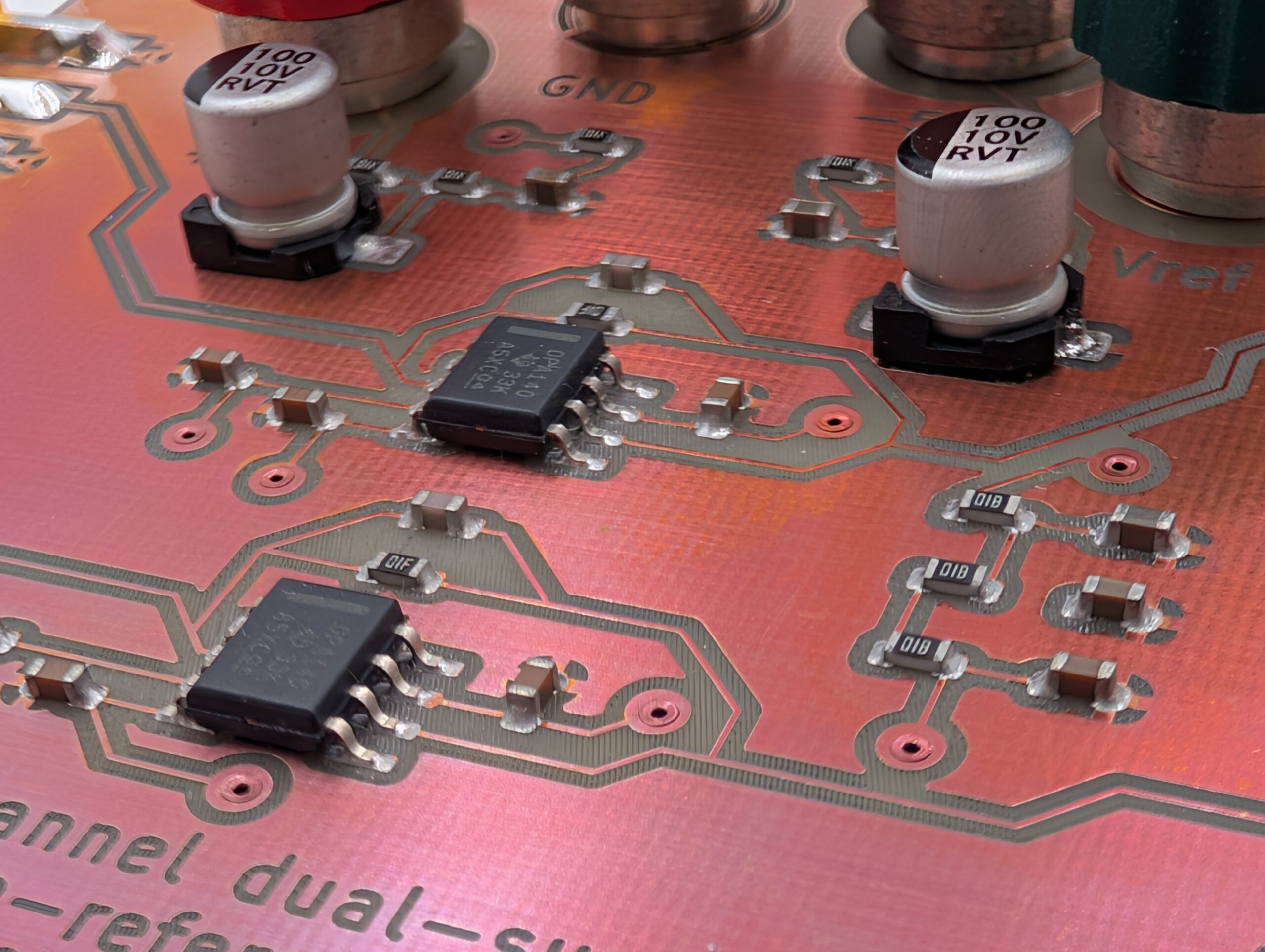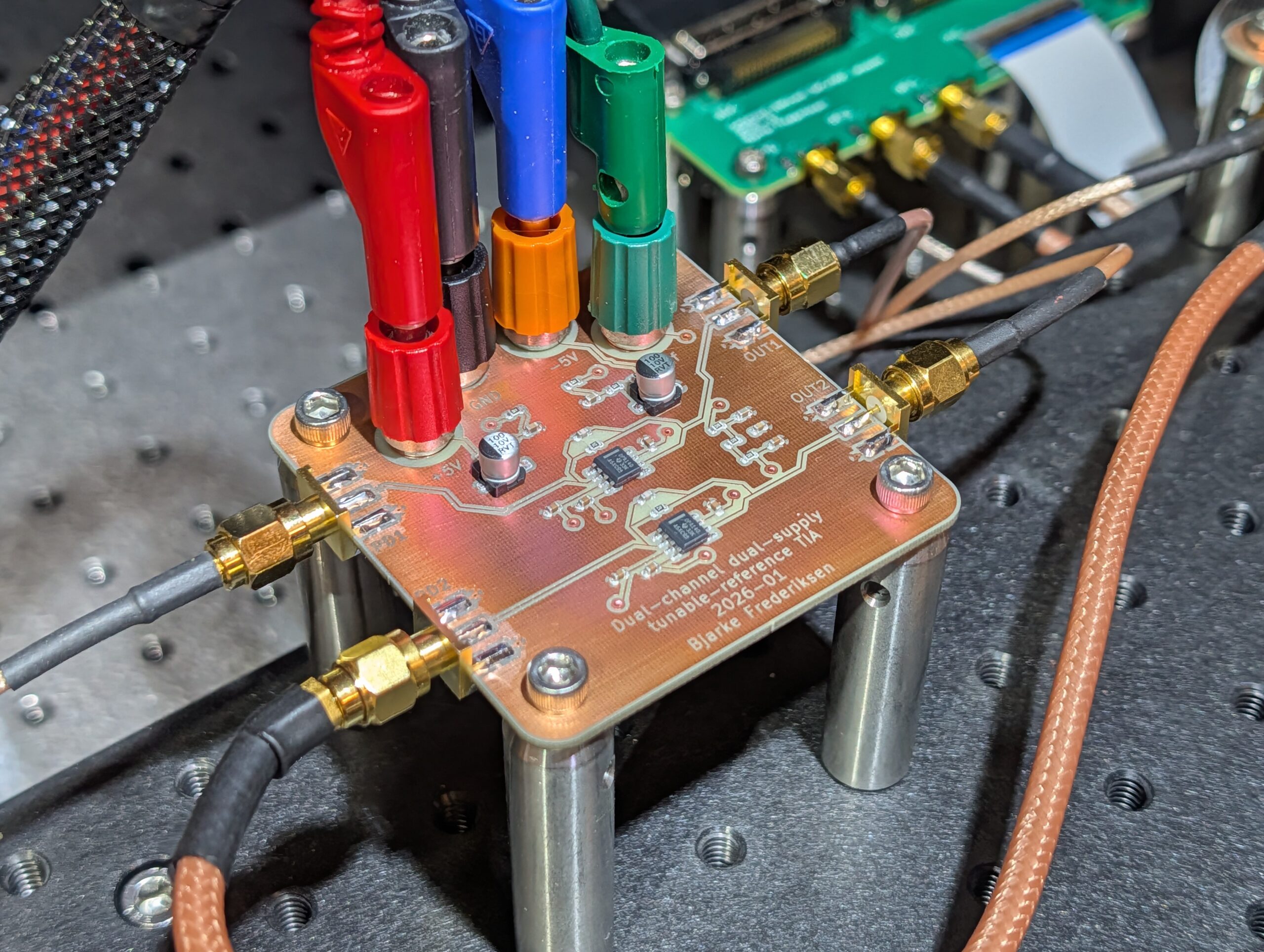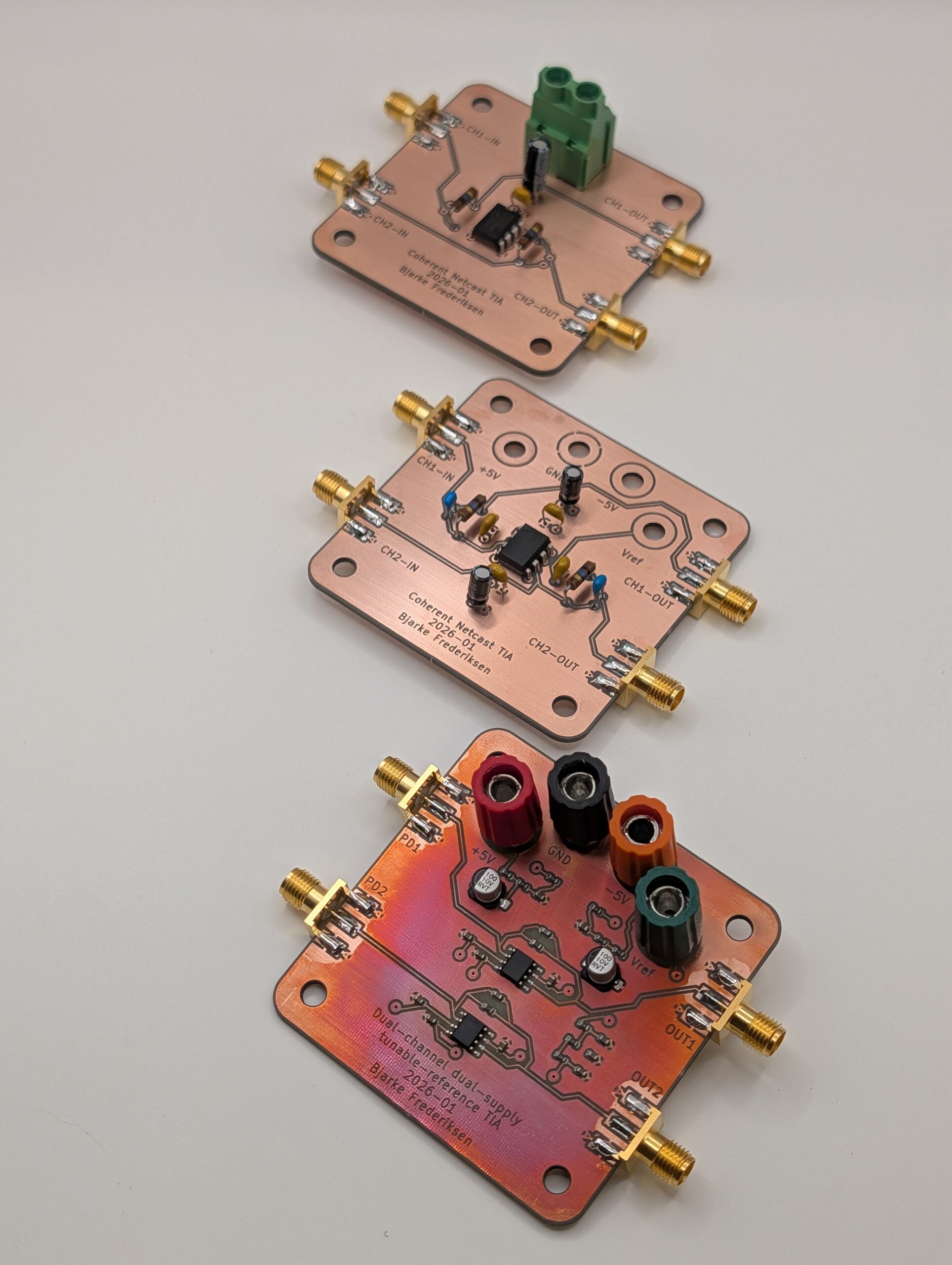 Through iterative prototyping in the Rodgers Lab, several TIA design revisions were developed—progressing from single-supply to dual-supply configurations, and finally adding RC filters to condition supply noise that was affecting measurements. A dedicated breakout PCB was also fabricated to route a single photodetector output from FFC to SMA for external TIA processing before returning to the data acquisition system. The rapid turnaround enabled by Rodgers’ PCB prototyping tools allowed the project to adapt quickly when switching from a current-mode ADC to a voltage-mode alternative.
